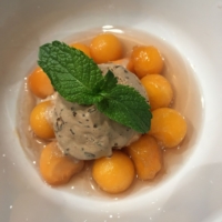 oeuf parfait (63°C), légumes de saison, jus corsé. - dessert: melon, sirop à base de Pineau des Charente et glace au chocolat